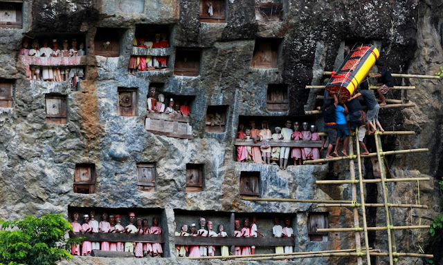 After the breakfast at the hotel we will pick you up for our first day toraja tour, first visiting LEMO VILLAGE, where we can see the stone grave are cut it on the wall highly rock with wooden statues, KAMBIRA the extraordinary baby grave inside the living tree, TAMPANG ALLO the cave with oldes coffins, bones and skull arround the cave, KARUAYA the small village with traditional houses . in the afternoon back to the hotel.